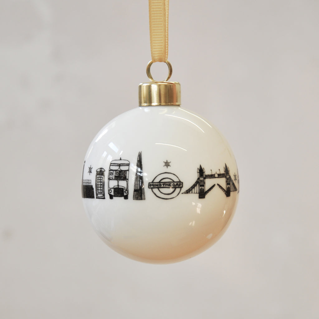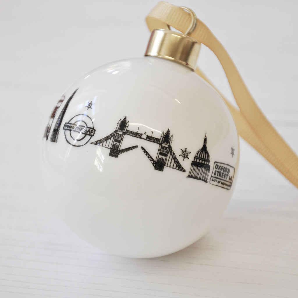 Familiar iconic images of London circle this fine bone china bauble, designed to remind you of Europe's most popular capital city while enjoying all the fun of Christmas. A perfect gift for Londoners at home or away, or a special treat for yourself.